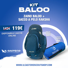 Kit composto dallo zaino Baloo e dal sacco a pelo Raksha.