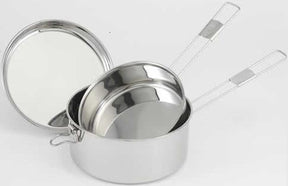 Articolo esclusivo scout, composto da tre elementi: pentola con manico, piatto con manico e piatto senza manico.